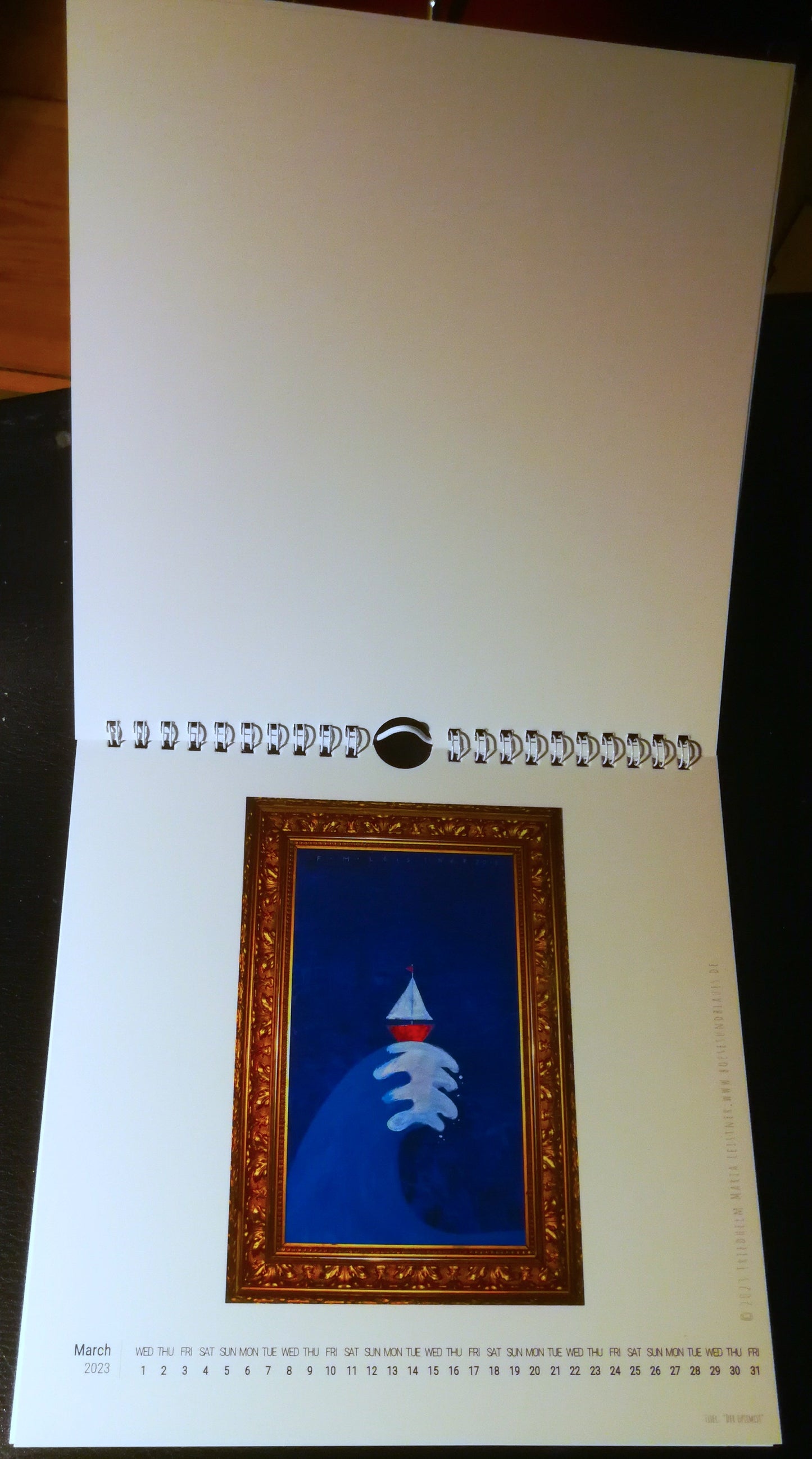 Zwölf blaue Motive des Berliner Künstlers Friedhelm Maria Leistner. Er malt stets in goldenen antiken Rahmen mit mehr oder weniger starken Gebrauchsspuren. Der Berliner Kulturkalender schrieb: "Leistner packt schrulligen Schwarzen Humor in üppige Goldrahmen."